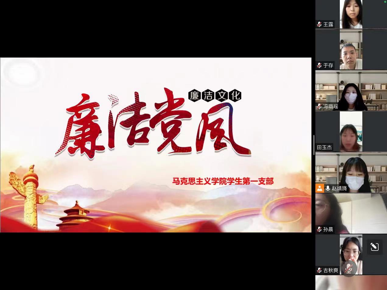 学生党支部召开廉洁教育主题党日活动,由党支部书记赵婧旖主持,班主任刘燕和支部全体党员参加。
