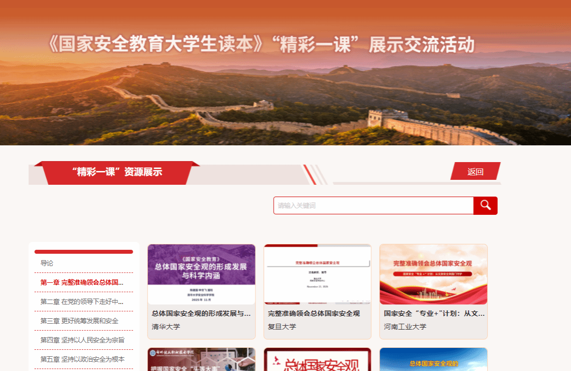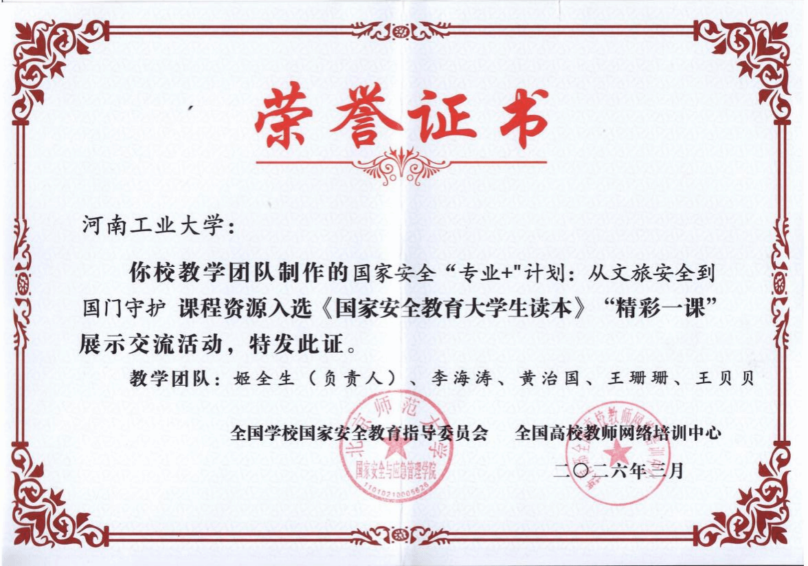 报送的《国家安全“专业+”计划:从文旅安全到国门守护》成功入选,现已在全国高校教师网络培训中心、中国大学生在线等国家级教育教学平台上线展播。