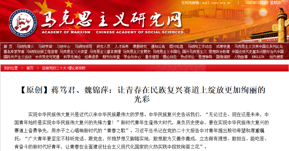 蒋笃君教授学习研究宣传阐释党的二十大精神的理论文章《让青春在民族复兴赛道上绽放更加绚丽的光彩》。