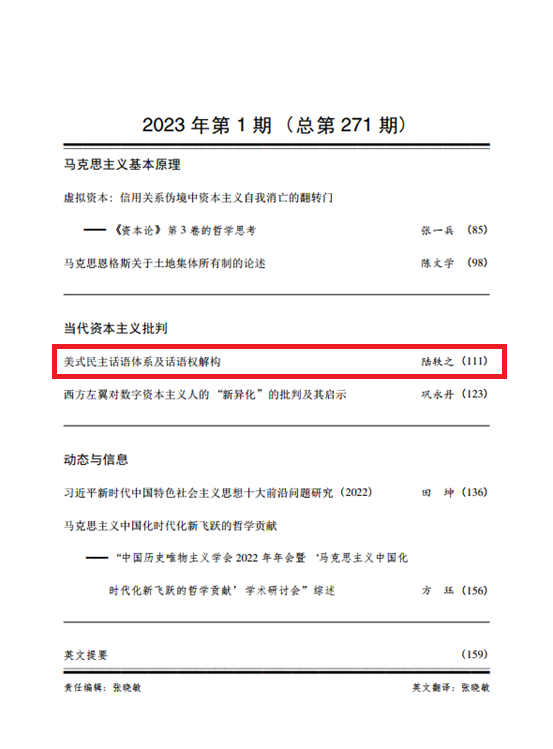 陆轶之副教授在国内权威A类期刊《马克思主义研究》2023年第1期发表题为《美式民主话语体系与话语权解构》的文章,这是抖音黑料