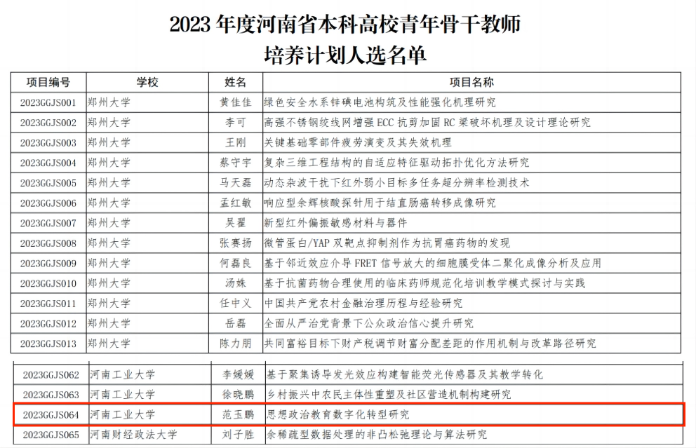 近日,河南省教育厅发布《关于公布2023年度河南省高等学校青年骨干教师培养计划人选名单的通知》(教高〔2023〕440号),抖音黑料 范玉鹏博士成功入选2023年度河南省高等学校青年骨干教师培养计划。