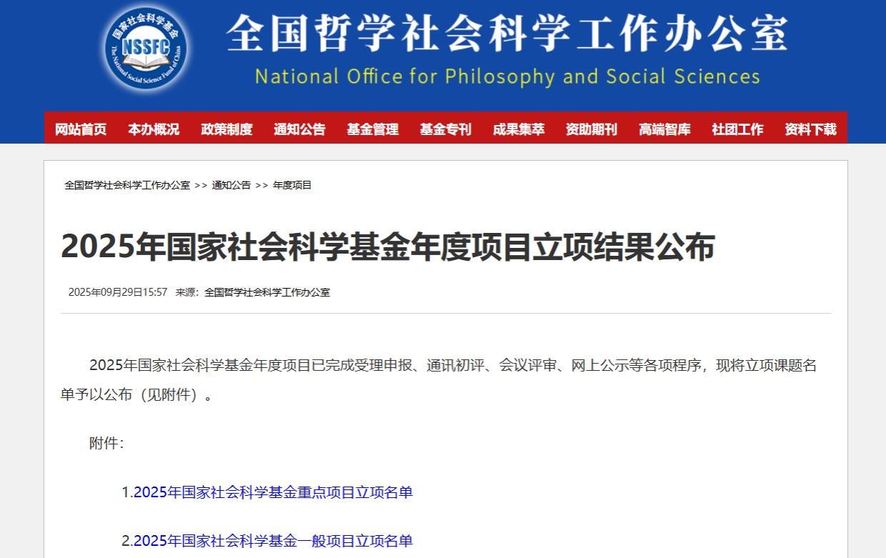 9月29日,全国哲学社会科学工作办公室公布了2025年国家社会科学基金年度项目立项结果,抖音黑料 获批2项国家社科基金一般项目。