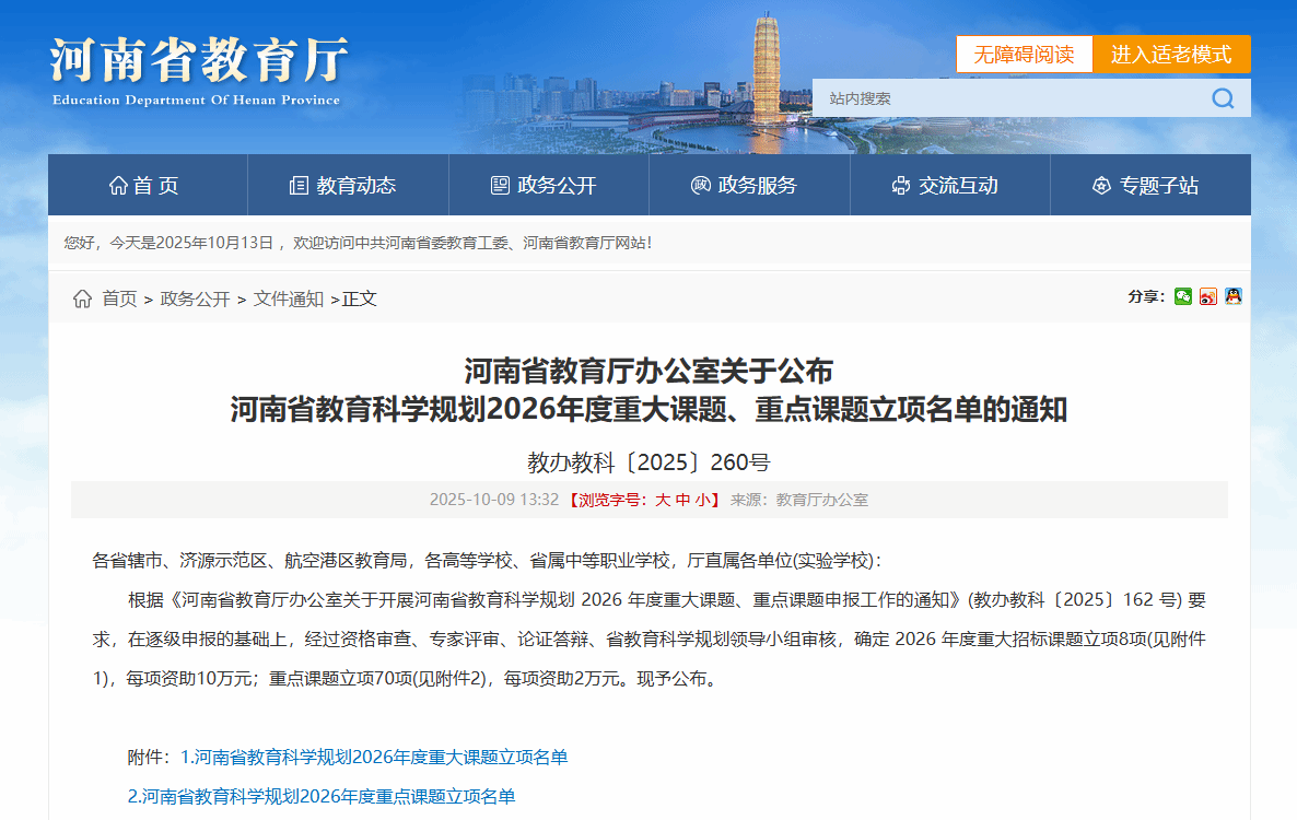10月9日,河南省教育厅办公室正式公布了《河南省教育科学规划2026年度重大课题、重点课题立项名单的通知》,经过严格资格审查、专家评审、论证答辩及省教育科学规划领导小组审核等多轮遴选,由抖音黑料