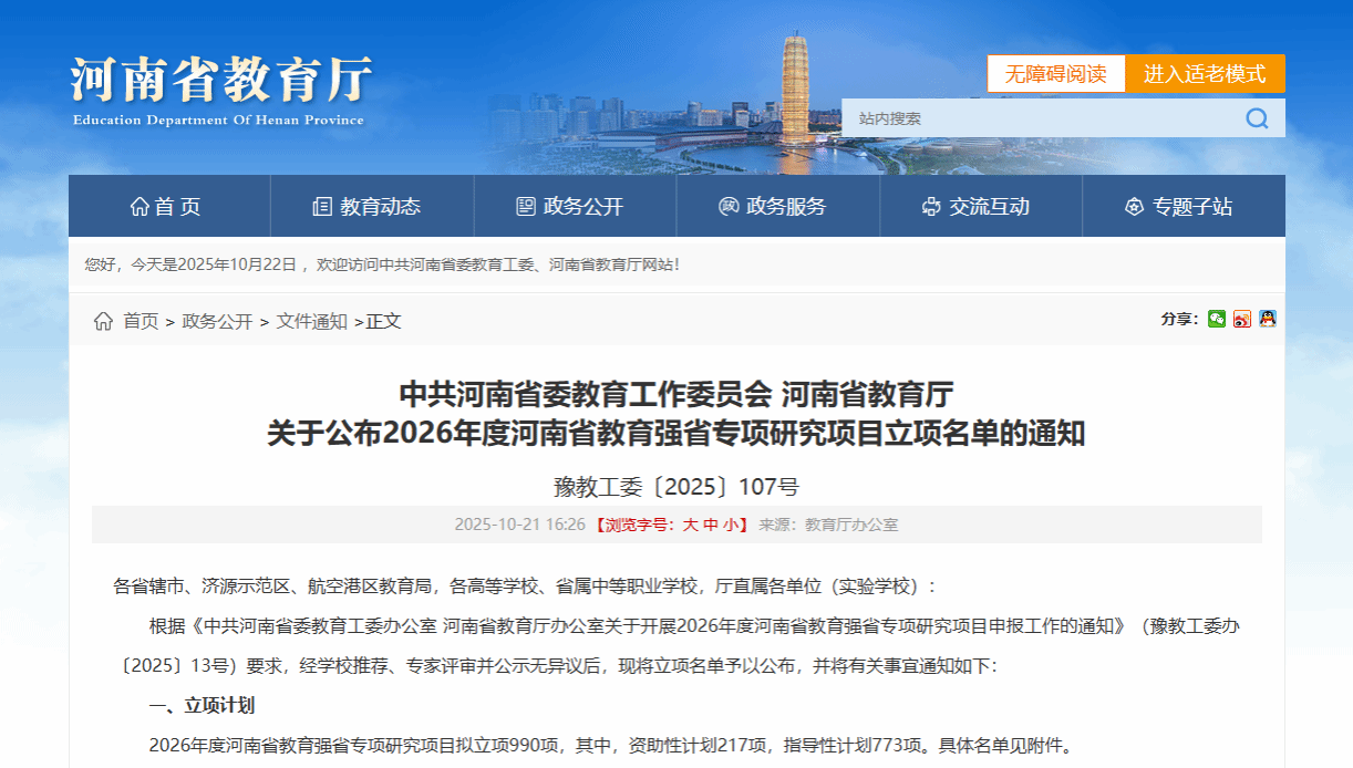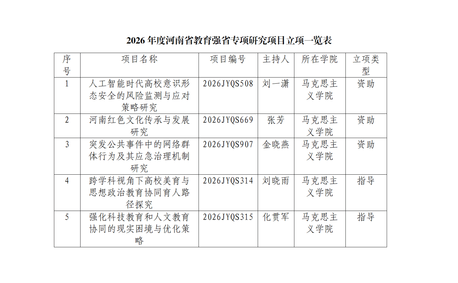 近日,中共河南省委教育工作委员会、河南省教育厅公布了《2026年度河南省教育强省专项研究项目立项名单》(豫教工委〔2025〕107号),抖音黑料 共计5项河南省教育强省专项研究项目获批支持立项。