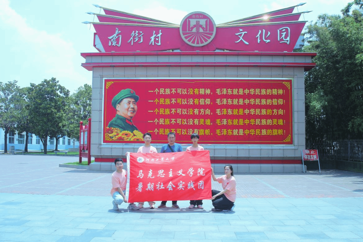 “这个世界是傻子的世界,由傻子去支持,由傻子去推动,由傻子去创造,最后是属于傻子的。”这句标语高挂在南街村村委会对面的高楼上,这是南街村人民所信仰的“雷锋精神”,也是南街村发展历程中伟大的精神力量。团队成员参观了南街村图书馆,走访了南街村住宅区,在街道上随处可见毛泽东语录,在每处建筑上都具有红色文化的印记,每走一步都能感受到无产阶级事业在这片土地上生根发芽的厚重感,加强了每个人对共产主义事业的认识。通过对南街村的学习观摩,小队成员都深刻的感受到了革命文化和红色基因的知识与力量,明白了作为新时代青年应该承担的责任与义务,努力成长为社会主义的建设者与接班人,不断为中华民族伟大复兴而不断奋斗。