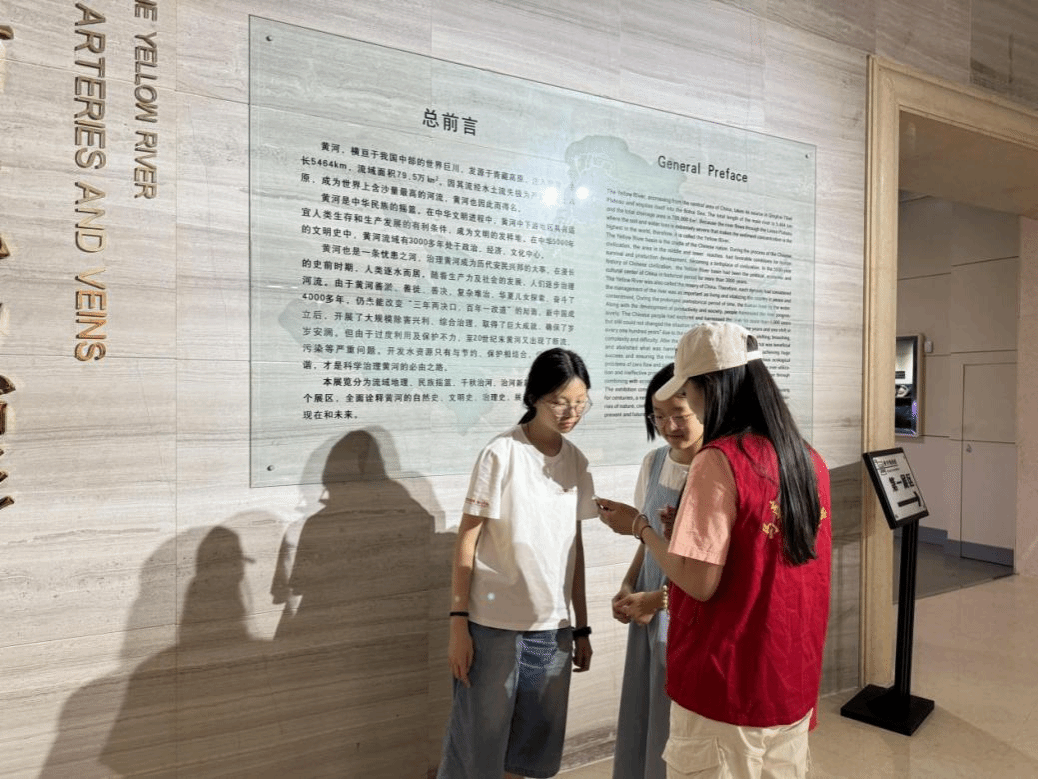 黄河,塑造了中华儿女刚毅不屈的鲜明气质,作为新时代大学生要用自己的拼搏与奋斗,为黄河精神注入新的内涵。同时,也要深入学习黄河文化、水利科学、中华文明等多方面知识,不断讲好黄河故事,传播黄河文化。在团队成员参观学习的过程中,遇到了前来博物馆研学的附近中学的初二学生,她们对此次践行团的活动展现出了浓厚的兴趣,询问了实践情况,小队成员向她们热情地介绍了团队活动的路线、学习的精神等,积极展示了工大马院不懈进取与追求卓越的精神和马院学子重视实践、知行合一的学习风采。