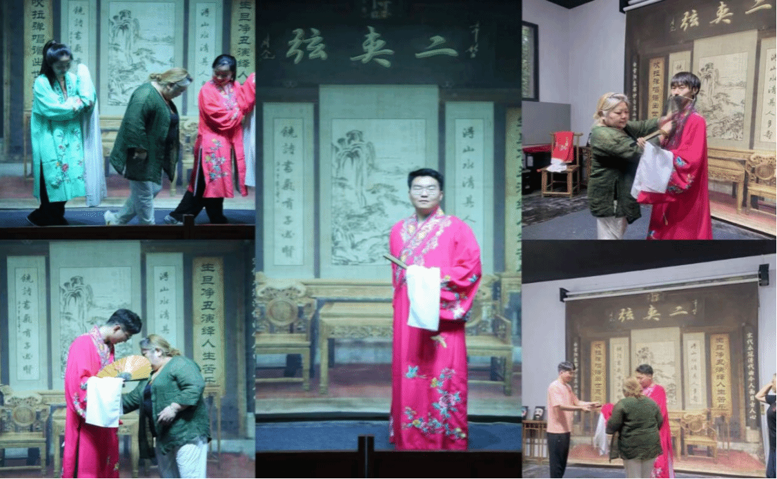 老师亲身示范了二夹弦的经典唱段,领略二夹弦的艺术魅力。最后,老师带领团队成员们体验了穿戏服。在表情、手势、身姿等各方面,老师们都做了详细的解释和示范,队员们潜心学习、悉心领悟。站在戏台上,好像是和田奶奶“对话”。