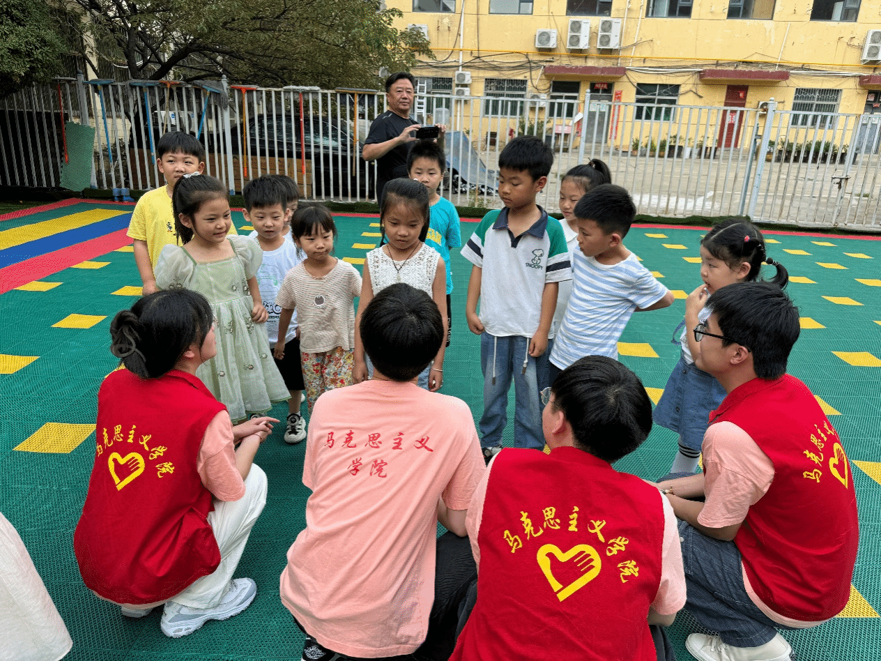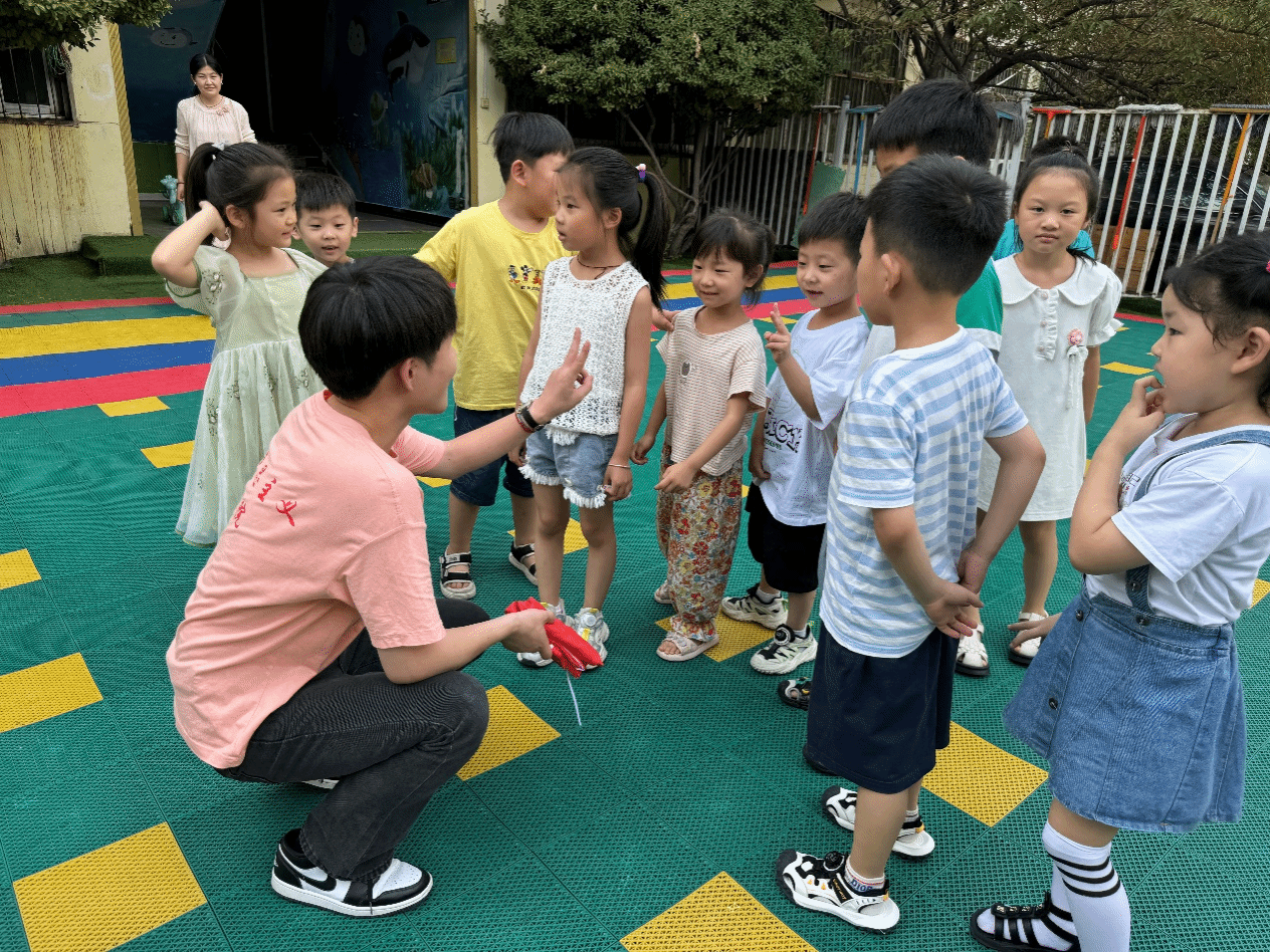 为缅怀革命先烈,弘扬民族精神,把红色文化引进校园、走进课堂、走入学生的心灵,把红色资源转化为教育资源,用红色文化引领学生健康成长,实践团队首先来到了平舆县新蒙氏幼儿园,团队成员从“知行合一”的原则出发,培养小朋友们坚定理想信念,自强不息精神。在“行”上,团队成员为小朋友们精心准备了一系列小游戏,如“捉迷藏”、“老鹰捉小鸡”等,让孩子们在游戏中锻炼身体,培养团队合作精神。在“知”上团队成员们还为孩子们讲述了狼牙山五壮士的英勇事迹。他们用富有感染力的语言将五壮士在抗日战争中不畏强敌、英勇抗争的故事娓娓道来。孩子们听得津津有味,不时发出阵阵惊叹和掌声,纷纷表示要向狼牙山五壮士学习,做一个勇敢、坚强、有爱心的人。